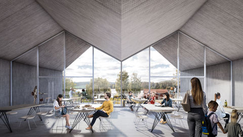 Su presencia elevada en la ladera permite la integración visual del mismo sin renunciar a la contemporaneidad de su uso y diseño. La idea de transversalidad aparece dentro del museo al permitir vistas continuas a través de partes del edificio que ponen en relación los dos lados del paisaje en el que se inserta. Su desarrollo en dos plantas y un sótano permite mantener una altura respetuosa por debajo de la cubierta de Storhamarlåven. La diferente disposición de sus cubiertas combinadas genera una riqueza espacial interior excitante en la planta superior que alberga las Salas de exposiciones y Restaurante panorámico. El uso exterior del terreno forma parte importante del proyecto en una extensión mediante grandes terrazas ajardinadas relacionas con los programas interiores del Auditorio, la Biblioteca, la Cafetería y la Møterom para eventos. Asimismo, aparece un gran auditorio al aire libre orientado al Sur para eventos con buen tiempo protegido por el trazado del edificio.